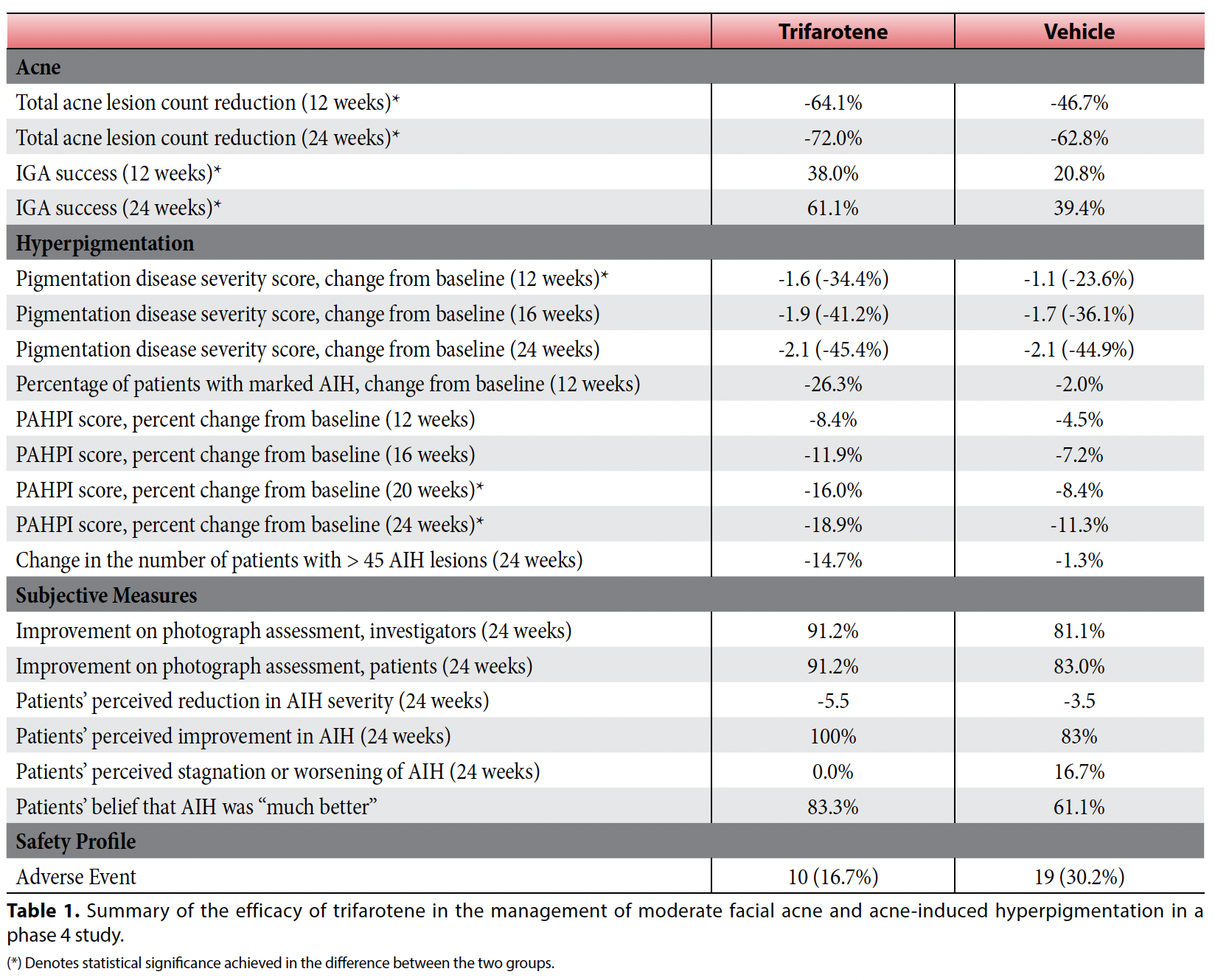 The PAHPI score, a secondary endpoint measured in this trial, represents a real-world reflection and should be considered by all clinicians as a quantifiable, reproducible way to measure disease-related concerns such as symptom severity and the impact of skin disease on patients’ quality of life.28 More specifically, it is a composite scale and includes quantification of the number, size and intensity of acne lesions.16 With regards to ODS, there was a statistically significant reduction in pigmentation with trifarotene as compared to the control at 12 weeks, however significance was not achieved at weeks 16 and 24. Overall, ODS decreased by -45.4% in the trifarotene group and -44.9% in the vehicle group, while the decrease in the percentage of patients with marked AIH at 12 weeks was much more impressive in the trifarotene group as compared to the vehicle (trifarotene -26.3%, vehicle -2%). Both the treatment and vehicle groups showing improvement at 6 months may be reflective of the natural rate of pigment clearance from the skin. For PAHPI scoring, statistically significant reductions in size, intensity and number of hyperpigmented lesions were observed in patients treated with trifarotene as compared to the control group at weeks 20 and 24, while sub-scores assessing size, intensity and number of lesions showed higher absolute and percent change in the trifarotene group as compared to the vehicle-treated group. Overall, there were greater reductions in PAHPI total facial scores in the trifarotene group (-8.4% at 12 weeks, -18.9% at 24 weeks) than the control group (-4.5% at 12 weeks, -11.3% at 24 weeks), with PAHPI sub-scores in the treatment group being nearly double those of patients treated with the vehicle. When determining improvement in AIH, over 60% of patients were noted to have lighter or much lighter skin when treated with trifarotene over 24 weeks, while the number of patients with over 45 AIH lesions decreased more significantly amongst treated patients than those who received the vehicle formulation (trifarotene -14.7%, vehicle -1.3%). Both subjects (trifarotene 91.2%, vehicle 83%) and investigators (trifarotene 91.2%, vehicle 81.1%) noted slightly better improvements in AIH with trifarotene as compared to the vehicle, which was also appreciated upon review of patients’ photographs.