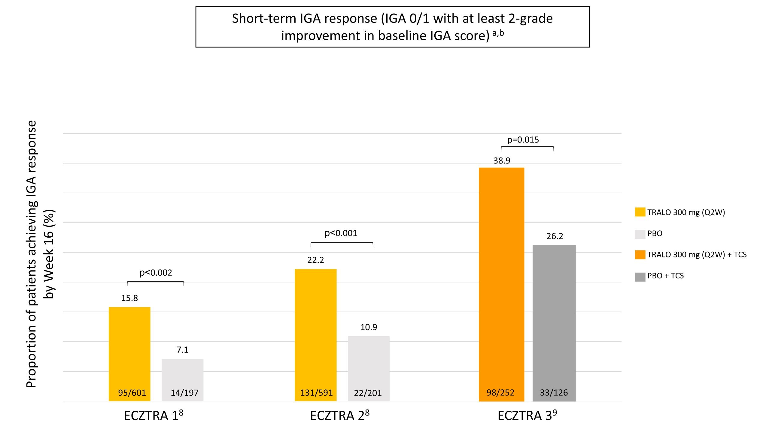 Study 3 (ECZTRA 3)9 | Tralokinumab (300 mg Q2W) + TCS | Tralokinumab (300 mg Q2W to Q4W) + TCSc | Placebo + TCS | P-value |