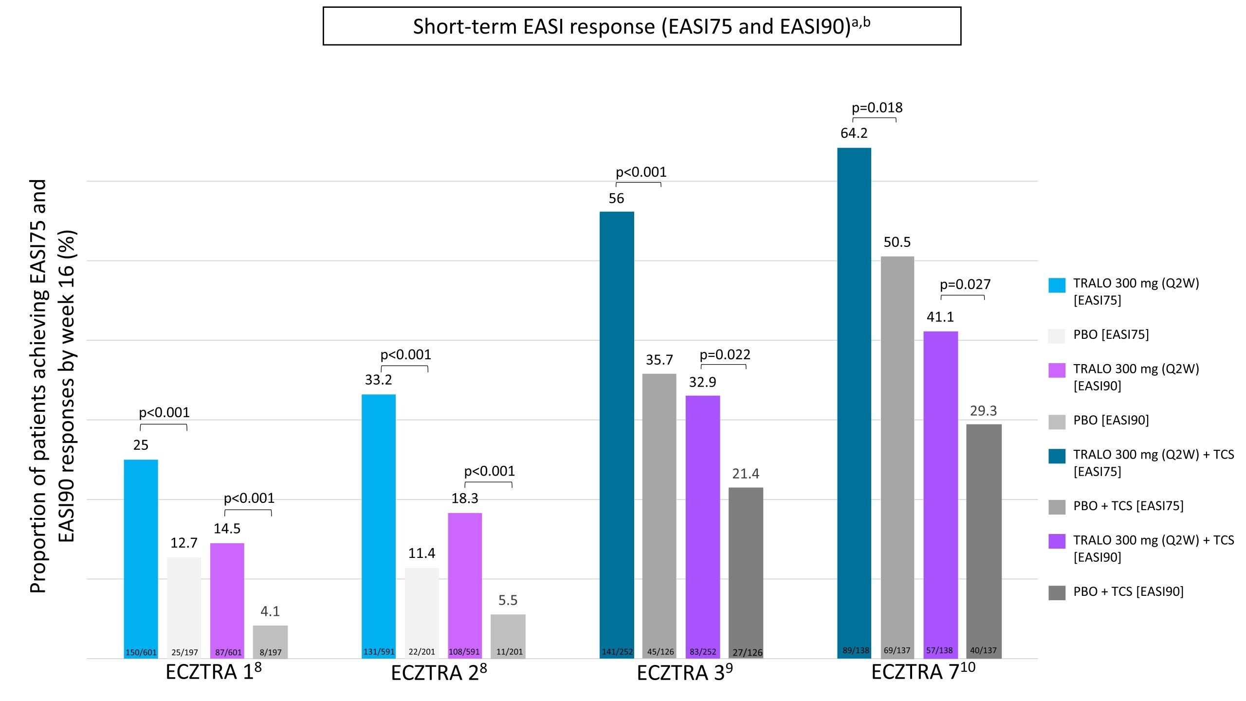 Study 1 (ECZTRA 1)8 | Tralokinumab (300 mg Q2W) | Tralokinumab (300 mg Q2W to Q4W)c | Placebo | P-value |