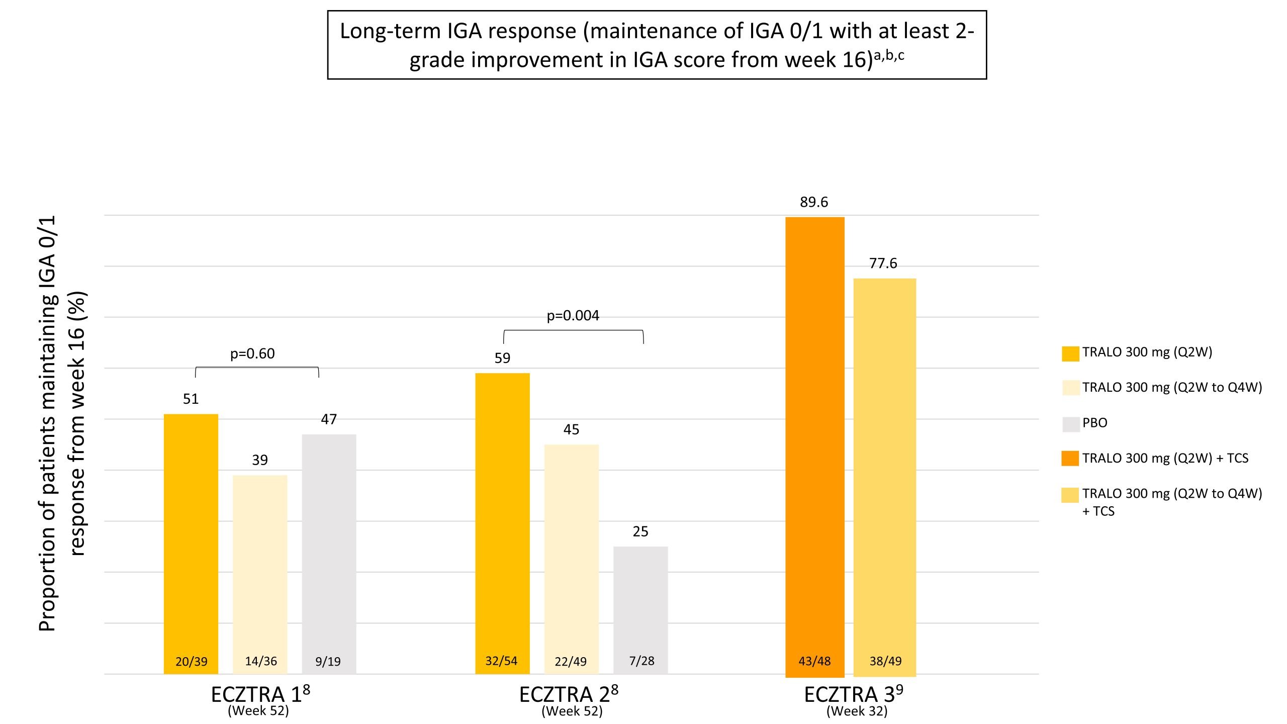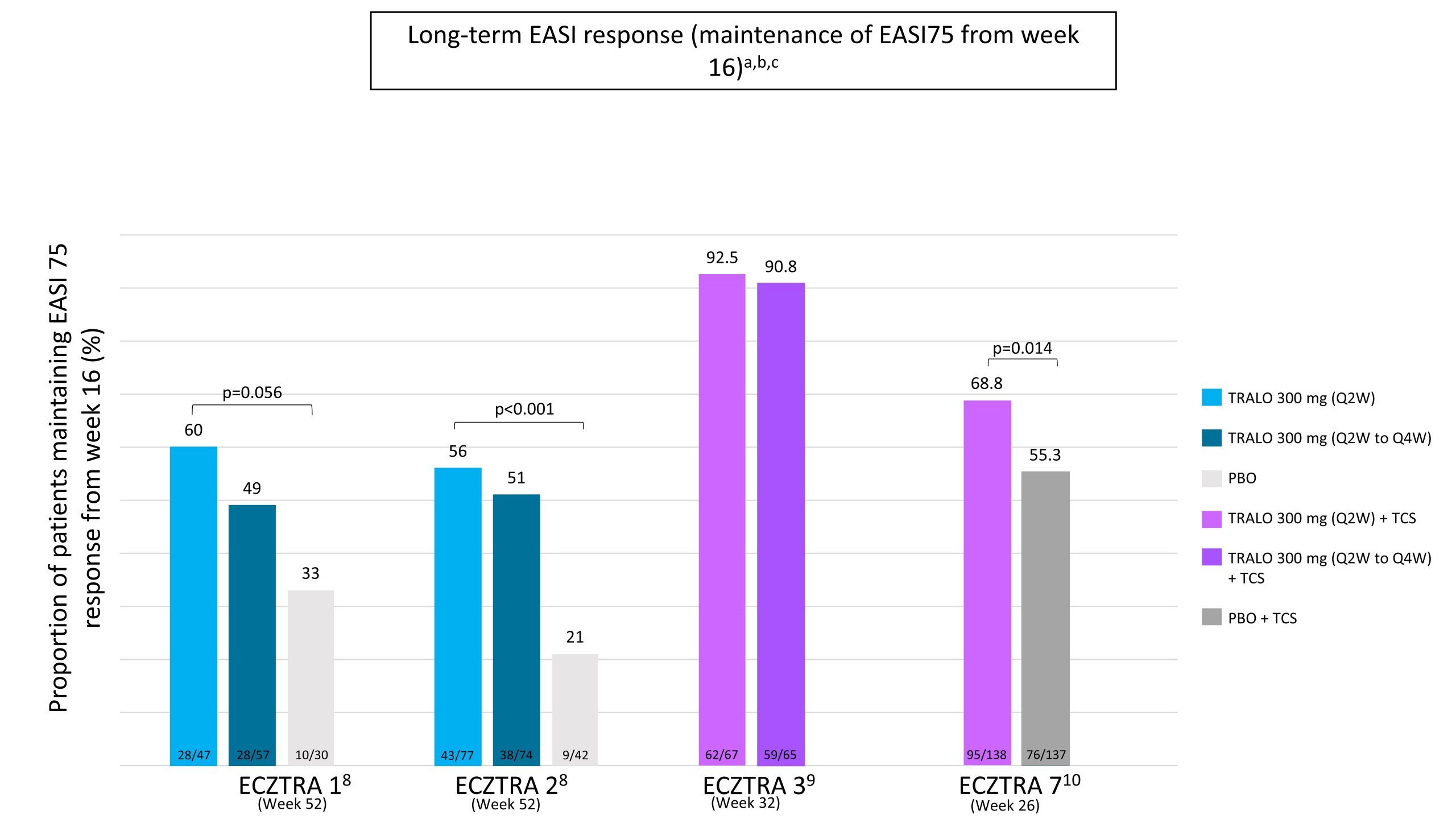 By week 52, IGA 0/1 responses achieved at week 16 with tralokinumab Q2W were maintained, without any rescue therapy (including TCS), by 51% (ECZTRA 1) and 59% (ECZTRA 2) of patients who continued to receive tralokinumab Q2W versus 47% (ECZTRA 1) and 25% (ECZTRA 2) of patients who were rerandomized from tralokinumab Q2W to placebo (p=0.60 and p=0.004, respectively) (Figure 4). In addition, by week 52, EASI75 responses achieved at week 16 with tralokinumab Q2W were maintained by 60% (ECZTRA 1) and 56% (ECZTRA 2) of patients who continued to receive tralokinumab Q2W versus 33% (ECZTRA 1) and 21% (ECZTRA 2) of patients who were rerandomized from tralokinumab Q2W to placebo (p=0.056 and p<0.001, respectively) (Figure 5).8 A subset of patients following week 16 were downdosed from Q2W to Q4W dosing of tralokinumab. By week 52, 39% (ECZTRA 1) and 45% (ECZTRA 2) of patients maintained their week 16 IGA 0/1 responses despite being switched from Q2W to Q4W dosing (Figure 4). In addition, by week 52, 49% (ECZTRA 1) and 51% (ECZTRA 2) of patients maintained their week 16 EASI75 responses despite being switched from Q2W to Q4W dosing (Figure 5).