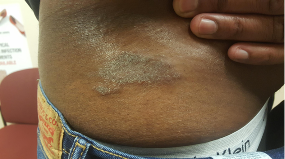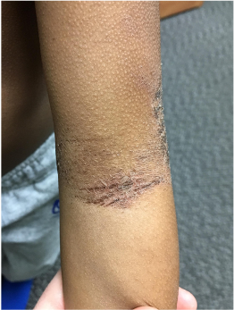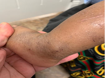 Delays in diagnosis or underestimation of severity may occur in patients with richly pigmented skin due to knowledge gaps in recognizing morphologic features of AD across the spectrum of skin complexions and racial/ethnic populations.19,64-66 Patients with richly pigmented skin may present with variations in the appearance of erythema (Figure 1). AD lesions may appear reddish-brown, violaceous, gray, or hyperchromic rather than bright red (Figure 2). Perifollicular accentuation, papules, scaling, lichenification, and pigmentary changes may be more prominent (Figure 3 and Figure 4). As a consequence, patients with SOC may present with a more advanced stage of AD severely impacting their QoL.19