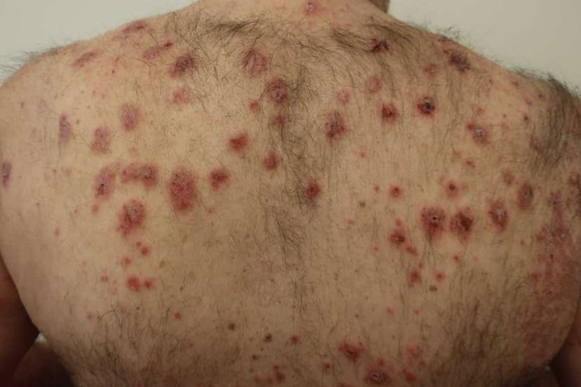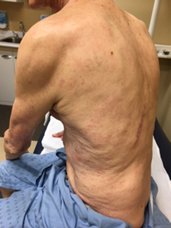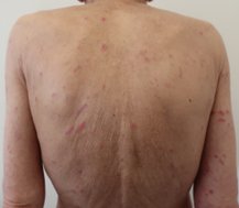 TDC – RA – 77-year-old male with metastatic non-small cell lung cancer treated with pembrolizumab (PD1 inhibitor) and binimetinib (MEK inhibitor) experiencing generalized pruritus with excoriated papules and nodules. a. left arm; b. back