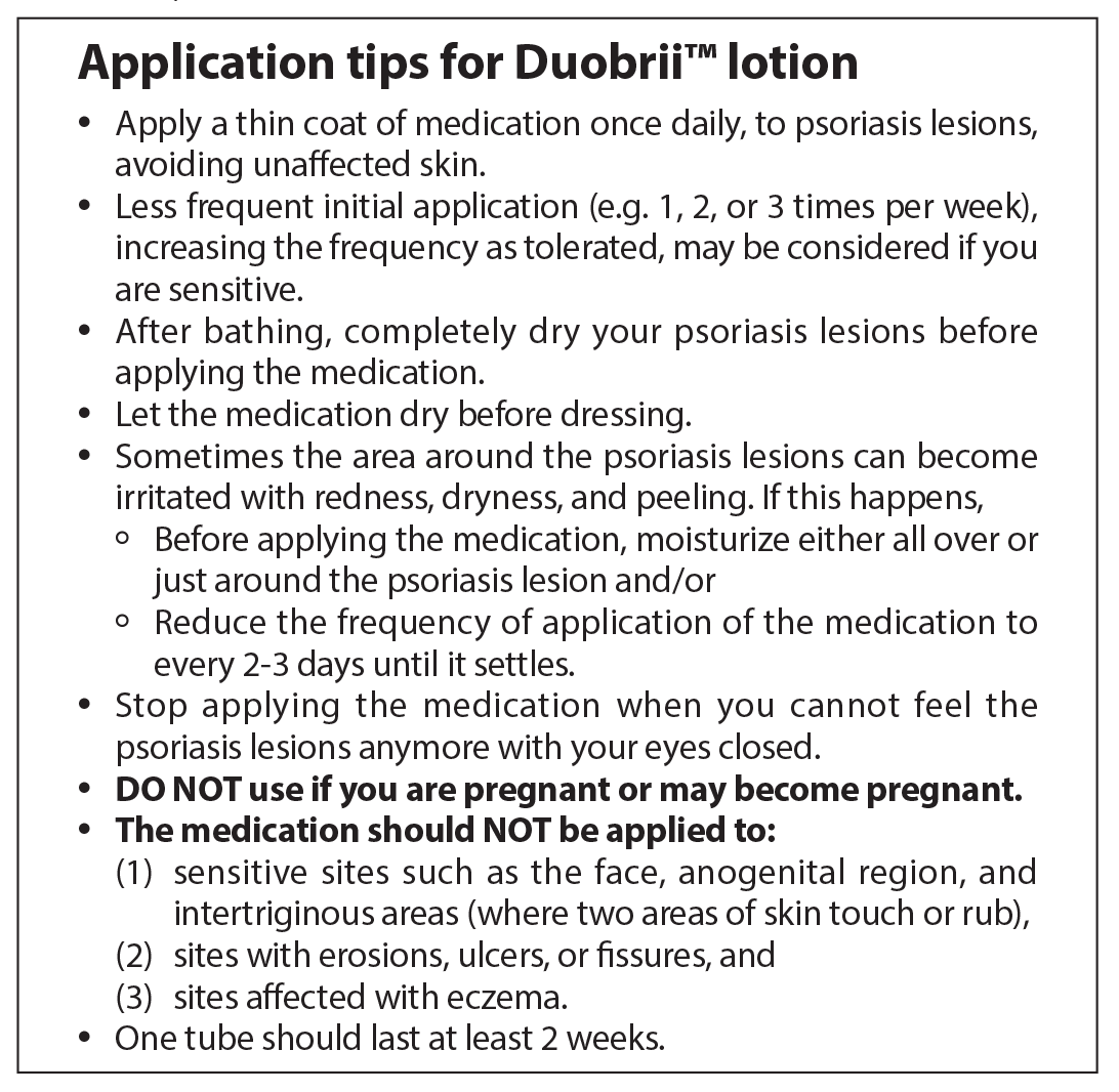 - DUOBRII™ (halobetasol propionate and tazarotene lotion) [product monograph.] Revised June 8, 2020. Bausch Health Canada Inc., Laval, QC. Available at: https://pdf.hres.ca/dpd_pm/00056991.PDF. Accessed October 3, 2021.