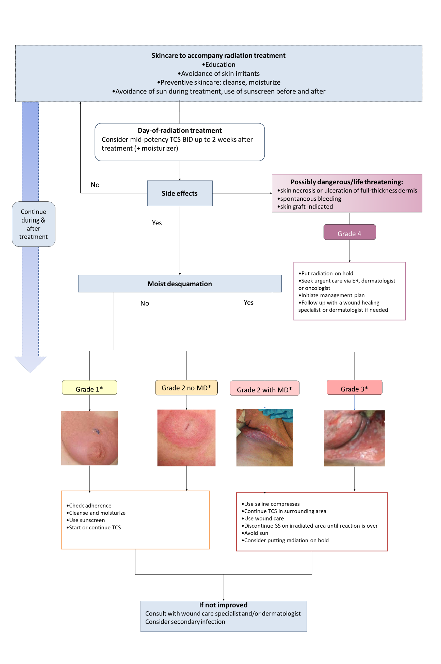 The Canadian Skin Management in Oncology Group (CaSMO) developed an algorithm for the reduction of severity and management of acute RD, which follows previous publications from this group that addressed general oncology-treatment related cutaneous adverse events [AEs], prevention, and skin management.8,13