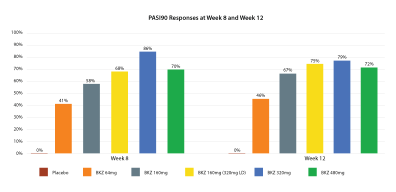 Significantly more patients also achieved PASI75 (62%-93% vs. 5%, p<0.0001), PASI100 (28%-60% vs. 0%, p≤0.0002) and IGA0/1 (51%-86% vs. 5%, p≤0.0001) at week 12 across all doses compared to placebo.