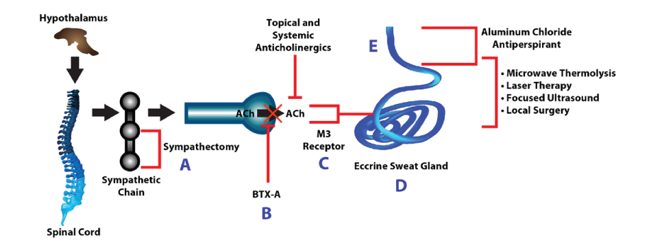 Primary focal hyperhidrosis, characterized as sweating beyond what is needed for adequate thermoregulation, can have a dramatic effect on quality of life and has an estimated prevalence of 4.8% in the United States.1,2 Primary focal disease differs from secondary hyperhidrosis in that it is located in discrete areas of the body (e.g. palms, soles, axilla, face or scalp) and is not induced by medications or other medical conditions.3,4 While a complete understanding of the cause or causes of primary focal hyperhidrosis remains unknown, its pathogenesis is thought to be linked to the thermoregulatory center of the hypothalamus and the autonomic nervous system.5 Post-ganglionic sympathetic cholinergic neurons release the neurotransmitter acetylcholine, which acts on eccrine sweat glands leading to sweat secretion.6 Increased sympathetic activity on eccrine glands can be induced by either emotional or thermal stimuli.7 Thus, potential treatment targets include the neurotransmitter, nerves, eccrine glands, and eccrine ducts (Figure 1).