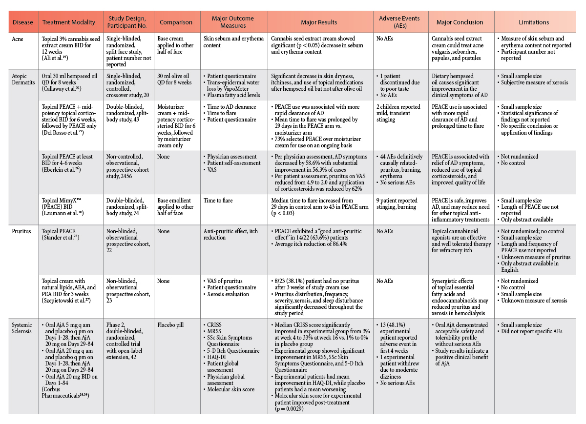 Hemodialysis patients, likewise, demonstrated improved uremic pruritus following use of topical AEA and PEACE. After twicedaily application, 8 of 21 (38.1%) participants had resolved uremic pruritus as validated by both VAS and questionnaire method.27 Overall, these findings indicate a therapeutic role for cannabinoids in the management of itch but double-blinded, placebo-controlled studies are necessary to further determine their efficacy.8