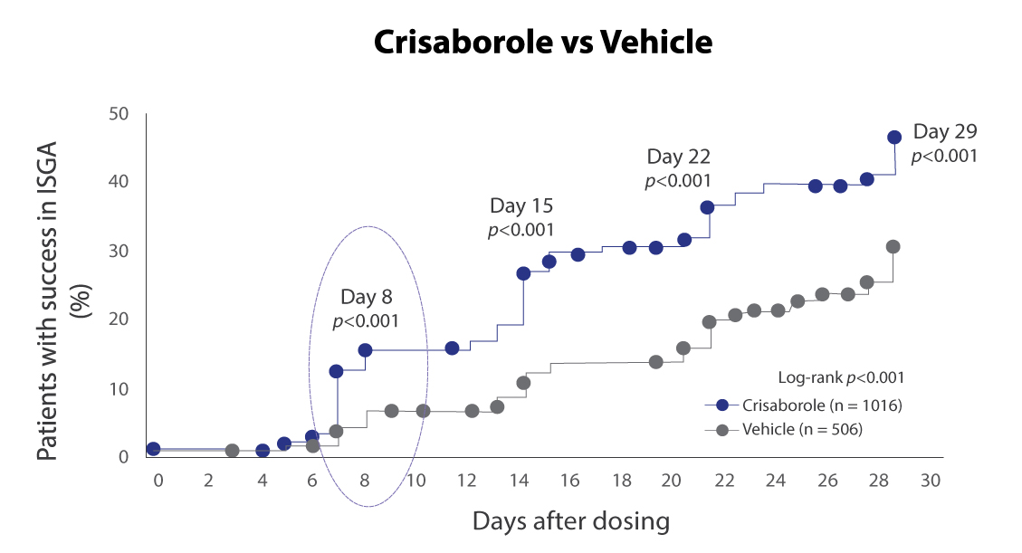 - AD-301 and AD-302 found that more crisaborole-treated participants achieved the primary endpoint (crisaborole-treated 32.8% vs. vehicle-treated 25.4%, p=0.038; crisaboroletreated 31.4% vs. vehicle-treated 18.0%, p<0.001 in respective studies).23