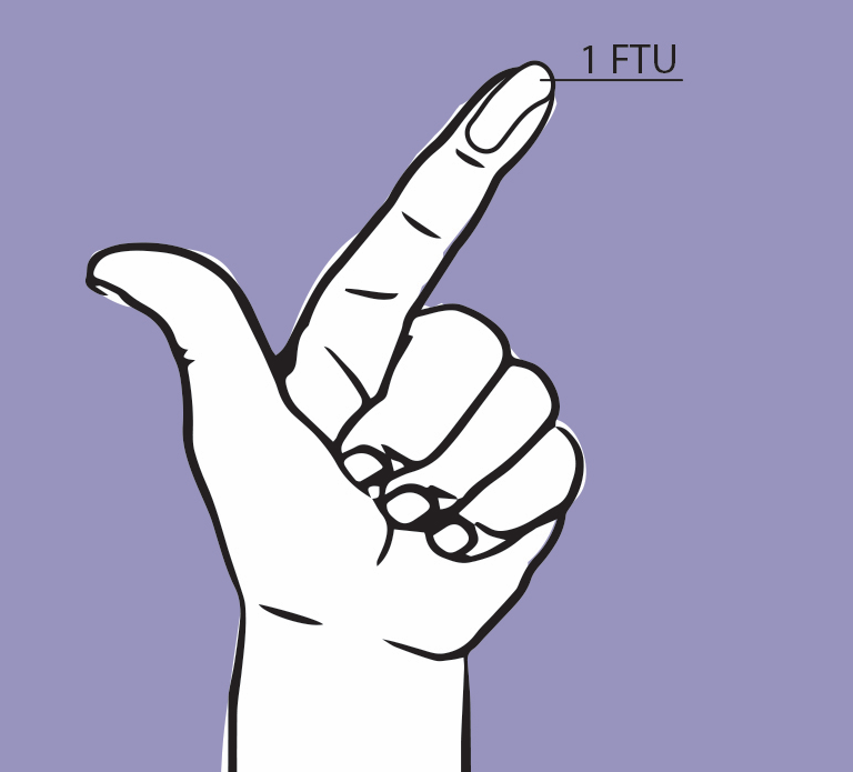 - The fingertip unit (FTU) is a system which aims to help guide patients quantify how much topical product to apply to their AD. A single FTU is defined as the amount of topical product extruded from a 5mm diameter nozzle applied from the distal interphalangeal joint skin crease to the tip of the digit.14 As a general guide, 1 FTU can cover approximately 2 hand prints of body surface area.