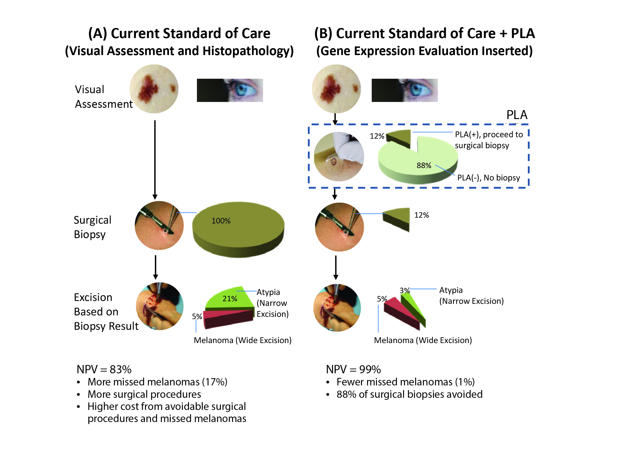 - In contrast to the current standard of care, the PLA has a very high NPV (>99%) coupled with a high sensitivity (91-95%), ensuring a very low probability of missing a melanoma.16,17