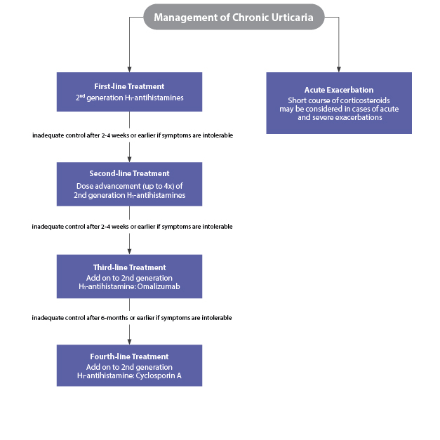 Urticaria guidelines are updated every 4 years by a joint initiative of the European Academy of Allergy and Clinical Immunology (EAACI) Dermatology Section, Global Allergy and Asthma European Network (GA2LEN), the European Dermatology Forum (EDF), the World Allergy Organization (WAO), and by the Canadian Society of Allergy and Clinical Immunology (CSACI). The most recently proposed guidelines were updated and presented at the URTICARIA 2016, GA2LEN Global Urticaria Forum: 5th Guideline Consensus Conference in Berlin in December 2016.5 These updates reflect the collaboration made by a group of 44 international experts, representing 42 societies from 25 countries. This review will summarize the current consensus guidelines for the treatment algorithm of chronic urticaria.