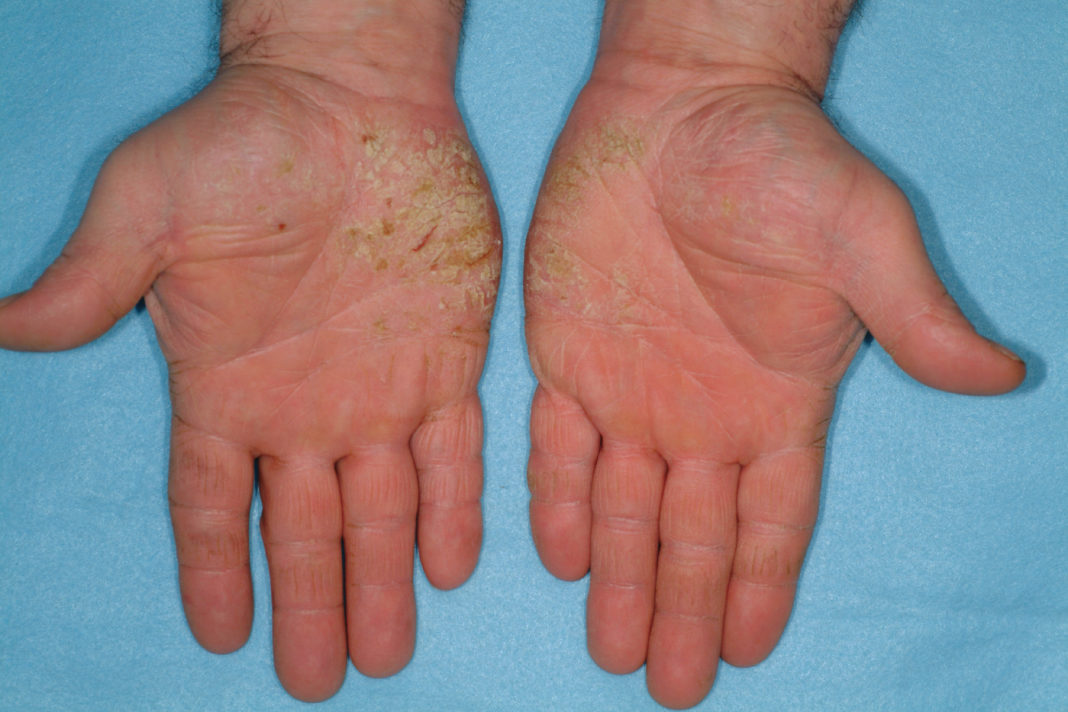A 39-year old dairy farmer presented with a 15-year history of redness, scaling and painful fissuring of the hands. He has used multiple potent topical steroids over the years with only temporary benefit. Despite the continued use of topical steroids he reported that his symptoms always return. After a skin scraping for fungal culture was taken and reported negative, he was referred to a dermatologist for assessment.