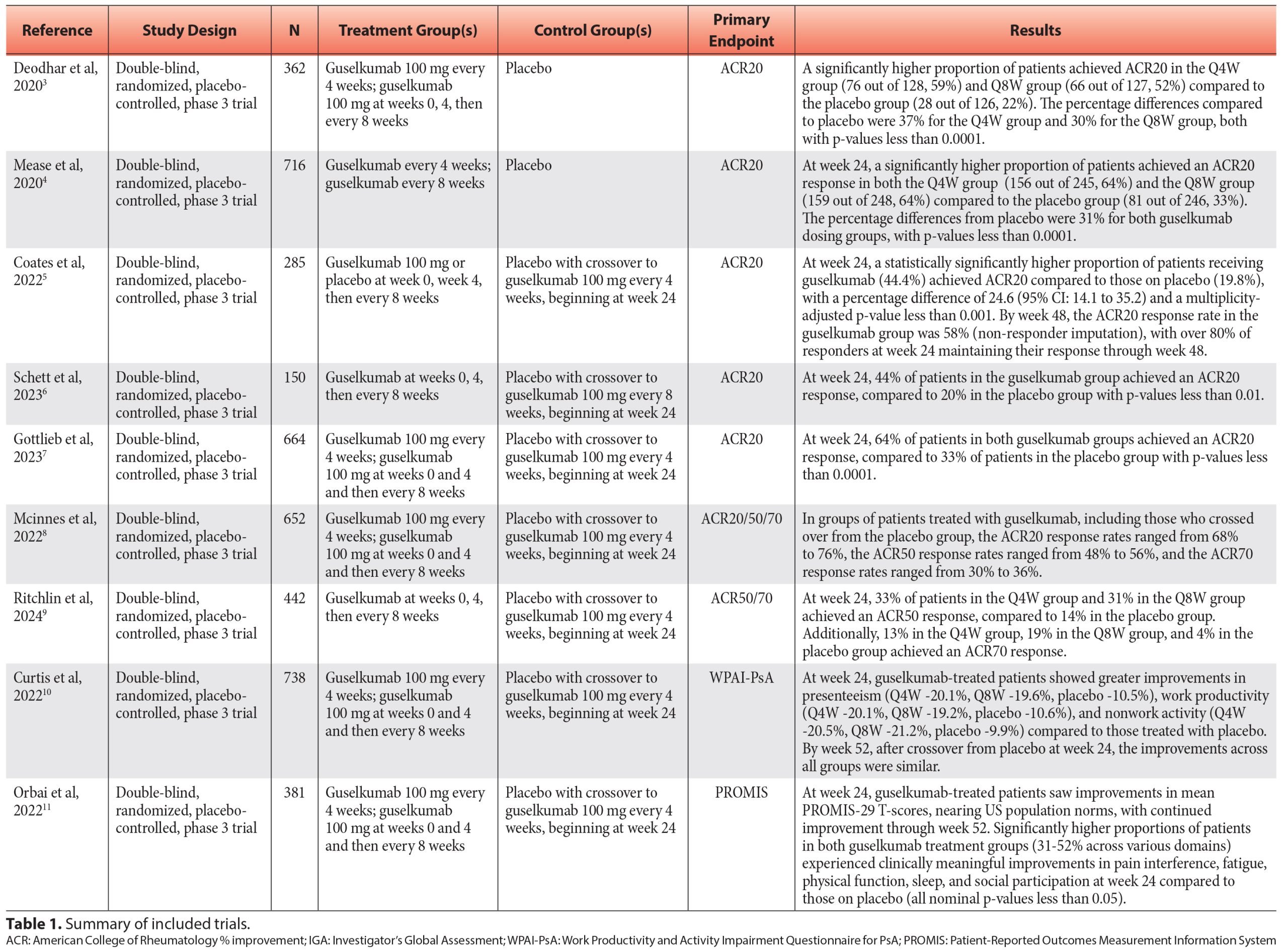 The included studies primarily consisted of double-blind, randomized, placebo-controlled Phase 3 trials that evaluated the efficacy of guselkumab in patients with PsA (Table 1). Across these trials, guselkumab demonstrated significant efficacy in achieving American College of Rheumatology (ACR) response criteria at various time points: